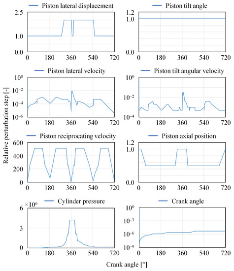Figure 3). The perturbation step sizes for these eight measurements (not related to the deformation of bodies), which were estimated using the default serial finite forward differencing method, were recorded during one operational cycle of the crankshaft mechanism. The evolution of the relative perturbation steps (the ratio between the actual and initial perturbation step) is depicted in