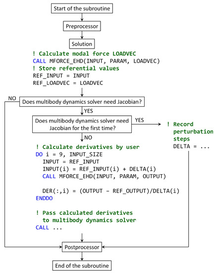 Equation (5) represents the most general way of estimating the modal force vector. Since this paper focuses on monolithic modelling of EHL in the MBD system (solution within one numerical integrator), the modal force is calculated within the user-written subroutine. The subroutine is called by the MBD solver whenever it must estimate the contact forces. Nevertheless, the use of Equation (5) in the subroutine bears the burden of high computational cost, as presented by Dlugoš et al. [