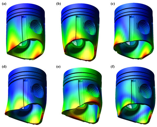 User method was applied to the MBD model of the piston–liner interaction (20 mode shapes of the flexible piston only—first six modes are depicted in