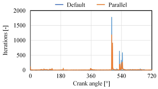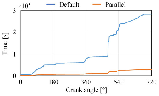 In the demonstrative case of this paper, the MBD model of the piston–liner interaction consisted of a box-type flexible piston with two piston skirts, each containing 29 circumferential and 17 axial nodes. This led to an increase in the mode shape count by 986. The subroutine had measurements related to the modal coordinate as per each mode shape as well as the time derivative of the modal coordinates. Therefore, the parallel DO loop for the Parallel method ran 1972 times. In each of these runs, the iterative solution of hydrodynamics is computed. Therefore, the parallel solution should rapidly decrease the computational time.