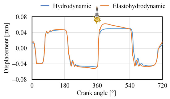Figure 10 depicts the change in the piston lateral displacement when the deformation of the piston skirt is neglected (the positive direction is towards the piston thrust side). The most significant difference between the hydrodynamic and the elastohydrodynamic solution occurs in the expansion stroke when the driving force of the piston secondary motion—the side force—reaches its highest values. The high deformation of the piston skirt allows the piston to travel further in a lateral direction.