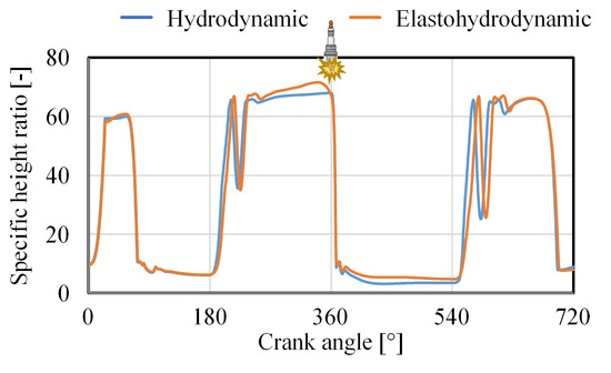 Figure 11 indicates this ratio on the thrust side of the piston for the hydrodynamic and the elastohydrodynamic solution. If the piston is considered as a rigid, the minimal value of the specific height ratio is 3.15 at a 439° crank angle. Enabling the piston to deform, the minimum value is increased to 4.76 at a 542.5° crank angle. If the limit value of the specific height ratio is set to three [