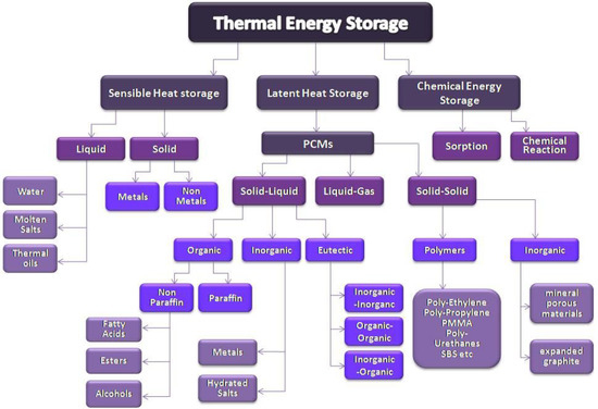 Energy storage systems aim for the conversion of energy into a form that can be stored in order to be used when there is necessity. Thermal energy storage system is a type of a sustainable energy storage system that is based on the utilization of materials that can store thermal energy when increasing their temperature and release it when the temperature is reduced. There are three types of TES systems: sensible heat, latent heat, and chemical storage system (Figure 1). The present work presents latent heat storage systems using PCMs [8,9].