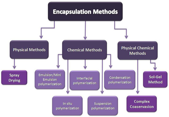 In physical methods, the material that creates the shell does not take part in any chemical reactions. The shell is mechanically applied on the core material by physical processes such as binding due to adhesion, drying, etc. There are a lot of physical methods, such as spray drying, vibrational nozzle, centrifugal extrusion, solvent evaporation, etc., although the method that is most used for microencapsulating PCMs is spray drying. The equipment and knowledge in this method is widely available. Additionally, the method can be easily scaled up, with average microcapsule size around some micrometers and efficient thermal performance; although, the high operating temperature, the agglomeration of microcapsules in the drying chamber, and the remaining uncoated particles are some its disadvantages [22,29].