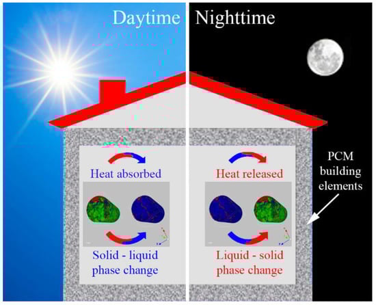 Passive application PCM systems exploit the naturally-available energy sources along with the architectural design of building components to minimize the energy requirements of building operations. The main characteristic of these systems is that there is no requirement for mechanical equipment or additional energy, due to the fact that the heat is charged or discharged only because of temperature fluctuations when the environment’s temperature rises or falls beyond the PCM’s phase change temperature (Figure 4). Passive application PCM systems in the building sector can be classified as systems that are integrated into the building materials, such as materials for the walls, the floor, the ceiling, etc., and as systems that are implemented as components to the building envelope, such as blinds, suspended ceilings, etc. [16].