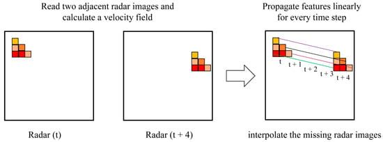Figure 2 demonstrates an example of interpolating 3 radar frames from 2 adjacent radar images. The features of Radar (t) were propagated according to the calculated velocity field to generate intermediate frames Radar (t + 1), Radar (t + 2), and Radar (t + 3). Apparently, the observed radar image Radar (t + 4) was only used in velocity field calculation, and the shape of the echoes was fully dependent on the first frame.
