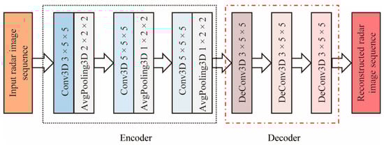 The CNN-ConvLSTM model was constructed by replacing the BiconvLSTM module in the BiRNN encoder (Figure 1b) with the ConvLSTM module. The 3DCNN model was also constructed as an encoder–decoder structure, as shown in Figure 3. The encoder consisted of 3 3DCNNs (Conv3D), each followed by an average pooling (AvgPooling3D) layer. The decoder consisted of 3 3DCNN transpose (DeConv3D) layers, as shown in Figure 3. Unlike RNN-based models, the 3DCNN model extracted high-level features by using all radar images together. Meanwhile, all the output radar images were decoded from the high-level features. The leaky ReLU activity layer was used for all 3DCNN and 3DCNN transpose layers.