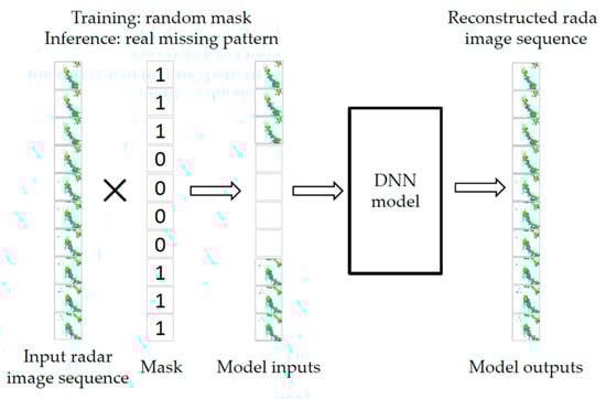 During inference, the input radar images were masked according to the real missing patterns. The scheme chart for the mask procedure and DNN model is shown in Figure 4. This procedure enabled the model to deal with any possible missing patterns. If no masks were given to the input radar images, the model would abstract features from every input radar image in the training procedure. However, in the inference model, the model will extract features from zero inputs as real radar images and subsequently obtain poor results. In the study, the missing pattern of a radar sequence of length 10 was denoted as 10 binary numbers, where element ‘0′ indicated missing frames and element ‘1′ indicated normal frames. The batch size was set to 8, and the training was stopped after ~160,000 iterations (i.e., 80 epochs). The mask ratio was gradually increased up to 100% at 10,000 iterations. The models were evaluated for every epoch, and the optimal model was chosen according to the highest validation loss for each model.