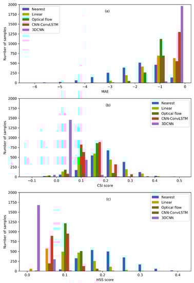 Six different missing patterns were involved in the evaluations in order to investigate the influence of the numbers of missing frames on the models. The first 5 patterns miss 1, 2, 4, 6, 8 successive intermediate frames, respectively. The last missing pattern misses 4 discrete intermediate frames. The chosen missing patterns were representative because the number of successive missing frames was usually not too high in real radar data sets. Table 1 presents the MAE, CSI-40 scores and HSS scores for the CNN-BiConvLSTM model and baseline models with respect to several specific missing patterns. It was found that the performances of the CNN-BiConvLSTM model were the best among all the models and for all evaluation metrics and missing patterns involved. Apart from the CNN-BiConvLSTM model, the 3DCNN model generally performed better than the other models. Whereas for the CNN-ConvLSTM, the performances were unstable and are highly dependent on evaluation metrics and missing patterns. Specifically, the MAE and HSS scores for the CNN-ConvLSTM model were generally better than those of the optical flow model, but the CSI-40 scores were poorer than those of the optical flow model, especially under conditions of multiple successive missing frames (e.g., ‘1000000001’). Considering identical network structures between CNN-BiConvLSTM and CNN-ConvLSTM except for the bidirectional structure, it can be inferred that the spatial–temporal information in both directions is quite important. This was also the reason why the 3DCNN model achieved a better performance. The output radar images in the 3DCNN model used encoded features from all input radar images (Figure 3), while the output radar images in the CNN-ConvLSTM model used only encoded features from previous radar images. When features from subsequent radar images were taken into account in the CNN-ConvLSTM model (i.e., CNN-BiConvLSTM), the performances were superior to those of the 3DCNN model. This result also implied the higher effectiveness of RNNs in extracting spatial–temporal features compared to CNNs. In addition to higher average scores, the scores of each sample for the CNN-BiConvLSTM model were found mostly higher than that of the baseline models. Figure 5 shows histograms for the missing pattern of ‘1110000111’ as a representative case. The differences of scores between the CNN-BiConvLSTM model and baseline models for test samples were found mostly less than zero for the MAE and larger than zero for the CSI scores and HSS scores. The results further highlighted the effectiveness of the CNN-BiConvLSTM model.