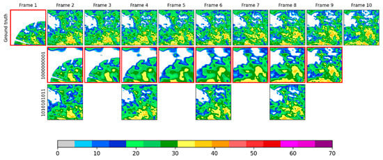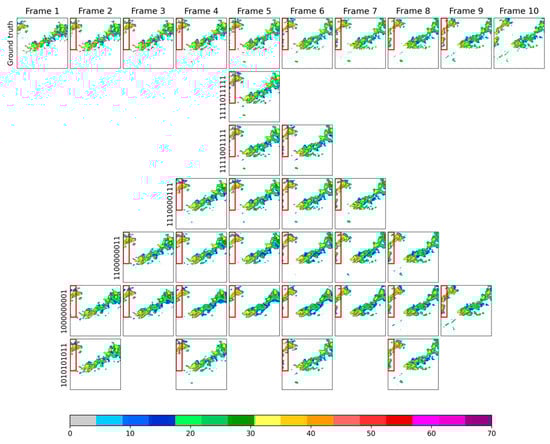Whether a DNN model, specifically the CNN-BiConvLSTM model, can deal with all the conditions with less qualified images was further investigated. By exploring plenty of samples, it was found that quite well-reconstructed frames can be obtained for the DNN models even with two less qualified adjacent frames. The only exception occurred when the less qualified images located at the ends of the sequence and the missing frames, were numerous enough. Figure 12 shows an example of the first frame being missing and interpolation by the CNN-BiConvLSTM model for missing patterns ‘1010101011’ and ‘1000000001’. The failure of the interpolation model was quite evident. Despite this failure, the problem can simply be avoided by extending the radar sequences by a step or two. Meanwhile, it was also found that the model performed well enough when the third frame was well qualified (third line in Figure 12).