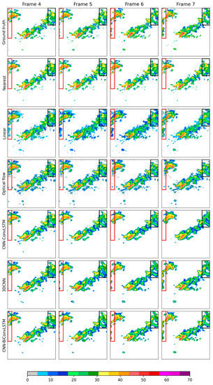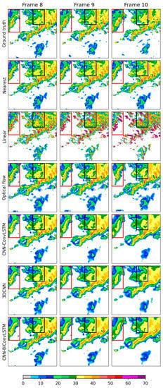 Figure 9 shows an example of extrapolation with missing pattern ‘1111111000’ for all the models tested in this study. The failure of the linear model was quite obvious. The clear sky area in the western margin area (the fourth line in Figure 9) revealed the poor ability of the optical flow method in dealing with newly emerging radar echoes. The extrapolated radar images of the CNN-ConvLSTM model, the 3DCNN model, and the CNN-BiConvLSTM model showed features close to the ground truth, but more detailed radar echoes can be obtained by the CNN-ConvLSTM model and the CNN-BiConvLSTM model. All these features can be clearly observed in the red and black boxes in Figure 9. The corresponding scores are shown in Figure 10. For this example, apart from the nearest neighbor approach and linear interpolation, which showed poor results, the other methods showed comparable results for the whole area and for subarea-2. The optical method was quite unsuccessful for subarea-1 because of the movements of the radar echoes.