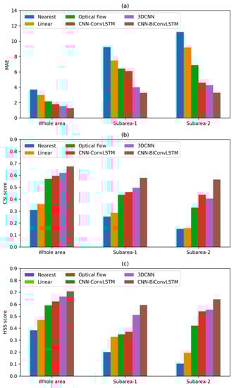 We evaluated the performances of all models with the mean absolute error (MAE), critical success index (CSI), and Heidke skill score (HSS) []. Mathematically, the CSI score was computed as