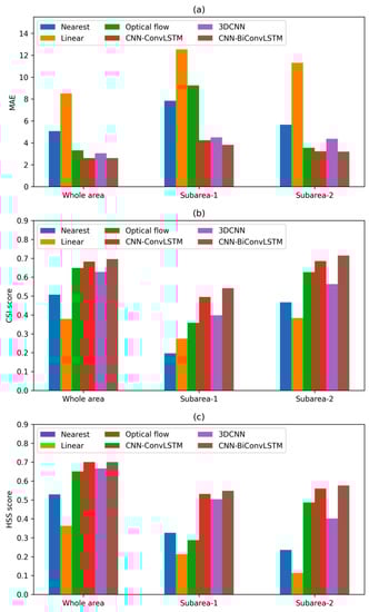 The reconstructed radar images for the selected example with respect to different models are shown in Figure 7, but only for the missing pattern ‘1110000111’. The performances of the CNN-BiConvLSTM model and the 3DCNN model were better on the whole, but with slightly more detailed echoes for the CNN-BiConvLSTM model. The reconstructed radar images from the CNN-ConvLSTM model lost much more detail compared to the ground truth. For the linear model, a large area of weak radar echo appeared around ground truth, and the strong radar echoes were diluted to some extent. For the optical flow model, the intensity of the radar echoes behaved quite well but exhibited an incorrect and fixed shape. More seriously, the reflectivity factors in some of the marginal areas in the reconstructed images were filled with zeros since the radar echoes moved out to other regions following the velocity field. Two subareas were selected to further demonstrate the effectiveness of different models for the marginal area (red and black boxes in Figure 7). The corresponding scores are shown in Figure 8. It was obvious that the traditional methods were quite unsuccessful in the two subareas, especially for subarea-2. The locations of the clear sky were quite distinct and correct for the reconstructed radar images in subarea-2 for the 3DCNN model and the CNN-BiConvLSTM model, but were not quite correct for the other models. In addition, the movements of radar echoes in subarea-1 can also be clearly observed for the 3DCNN model and the CNN-BiConvLSTM model but did not occur for the other models. In addition, the scores, which exclude the marginal area, were also tested, and they indeed showed slightly higher scores, but the order of the scores did not change. In summary, the CNN-BiConvLSTM model outperformed all the baseline models involved.