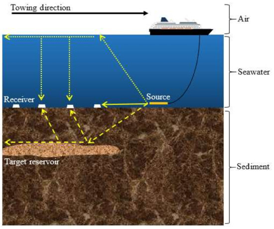 Illustration of the seabed logging (SBL) application in the deep marine environment. The source is towed by a ship and the electromagnetic (EM) receivers are placed on the seafloor beforehand. The target reservoir is in the sedimentary rock. The low-frequency EM waves travel in all directions (straight arrow: direct wave; dotted arrow: air wave; dashed arrow: guided wave).