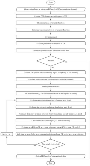 In order to evaluate or estimate the EM profiles at various “untried” depth inputs conforming to the testing input, , the posterior distribution of the testing output is defined in Equation (1). This work’s interest was to predict the depth parameter of hydrocarbon along the offsets from 11,840.80 m to 19,004.97 m. Thus, here, only the testing input variable of hydrocarbon depth, , is varied accordingly, while the remains unchanged. Note that the interested hydrocarbon depths in the GP regression are from 200 m to 1000 m with an increment of 20 m each (including the “tried” depths).