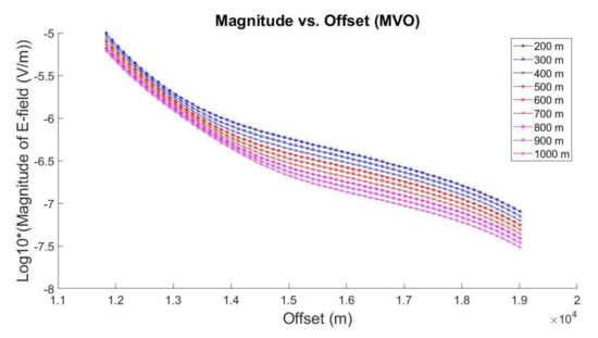 Magnitude of electric (E-)-field versus offset for nine different depths of hydrocarbon from 200 m to 1000 m with an increment of 100 m each.