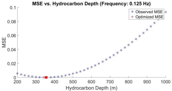 In this work, three random observational datasets were generated separately using the CST software where the depths of hydrocarbon were assumed to be “unknown”, i.e., 350, 650, and 950 m. Here, the goal was to find the best estimates of hydrocarbon depths of the observational datasets with the smallest MSE values. In other words, a small MSE value indicates that the EM profile evaluated by the forward GP model gives the most likely values for the observational dataset, thereby giving the best depth information. As discussed before, the step size of the optimization was determined by the learning rate. For this work, three different learning rates were used for every inversion scheme. The first scheme (1st observational dataset) used 0.051 as its learning rate, whereas the second (2nd observational dataset) and third (3rd observational dataset) schemes used 0.087 and 0.081, respectively. Details of how this work determined the suitable learning rates are provided in Appendix C. Plots of MSE versus learning rate and iteration number versus learning rate for every observational dataset are depicted in Figure A1, Figure A2, Figure A3, Figure A4, Figure A5 and Figure A6. After identifying the learning rate, optimization using the gradient descent was executed. Thus, three MSE versus hydrocarbon depth plots are plotted as shown in Figure 6, Figure 7 and Figure 8.