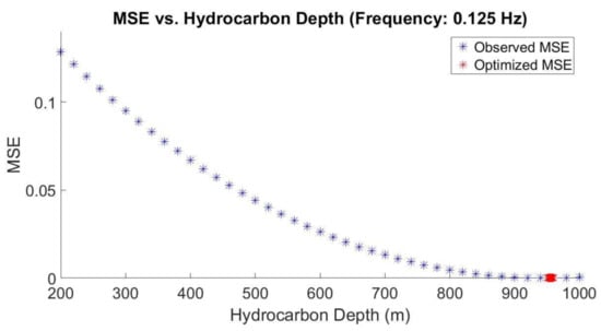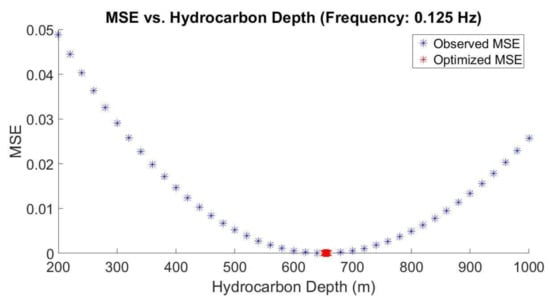 The fitted GP model is denoted as , where here includes all “tried” and “untried” depths. This means that, for every (i.e., 200 m–1000 m with a gap of 20 m), the GP gives estimates of the EM profile, , at distances from 11,840.80 m to 19,004.97 m. Assume that the observational dataset is observed at distance points and the hydrocarbon resides underneath the seabed but with “unknown” depth. To find out the depth of hydrocarbon of the observational dataset , the least square criterion is formed between the and . Mean squared error (MSE) is used as the loss function in the optimization algorithm. In general, MSE measures the average amount of squared differences between and . The loss function is expressed in Equation (6) as follows: