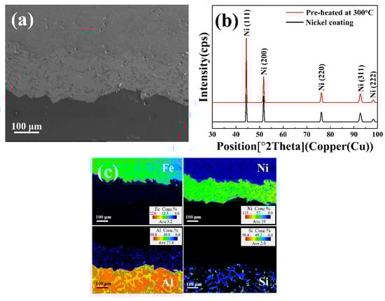 (a) SEM micrographs of the Al/Fe alloys hybrid structure’s interface with nickel coating; (b) XRD patterns of nickel coated steel before and after heat treatment at 300 °C; (c) chemical element quantitative maps of (a): Fe, Ni, Al, and Si.