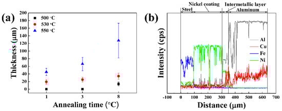 (a) The quantitative analysis of intermetallic layer thickness under different solution temperature and annealing times and (b) electron probe X-ray microanalyzer (EPMA) line mapping of the Al/Fe alloys hybrid structure’s interface under 550 °C heat treatment, followed by furnace cooling.