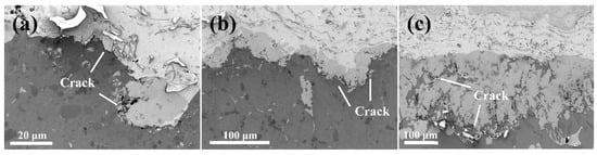where is the temperature change at which cracking and detachment are initiated at the interface between the aluminum alloy and the intermetallic phase, is the thickness of the intermetallic layer, is the difference in the coefficients of thermal expansion between the aluminum alloy and intermetallic phase, is Poisson’s ratio, and a is the length of the crack created at the interface as the temperature decreases during cooling. Among these parameters, and are intrinsic properties of the material and is a constant determined by heat treatment. Resulting from Equation (3), an increase in the intermetallic layer thickness induces a growth in the crack length []. Excessive heat treatment, including extreme solution temperatures and/or times, can trigger cracks at the interface, resulting in a decline in the bonding strength.