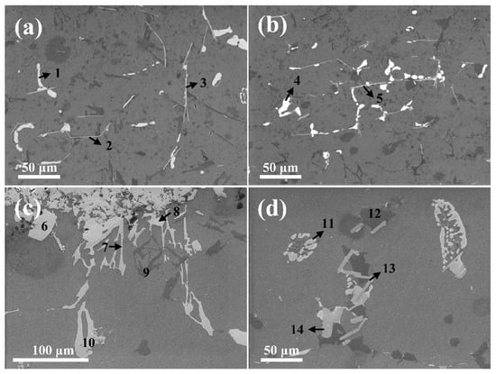 SEM micrographs of the intermetallic phases in the Al matrix according to distance from the interface under as-cast and 550 ℃ heat treatment conditions; (a) as-cast (near interface), (b) as-cast (far from interface), (c) 550 °C heat treatment (near interface), and (d) 550 °C heat treatment (far from interface).