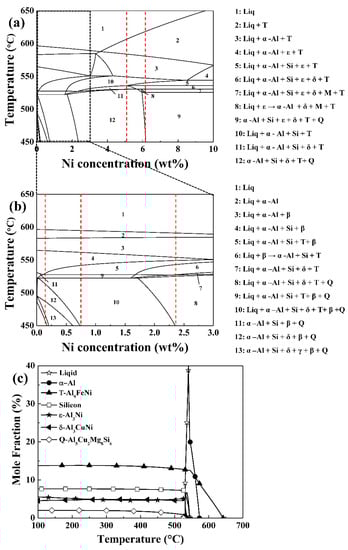 (a,b) Calculated phase diagram of the Al–Si–Cu–Mg–Fe system for different nickel ranges (0–10%), and (c) mole fraction of different phases as a temperature function in the Al-7.98Si-2.8Cu-0.64Mg-0.74Fe-8.62Ni system.