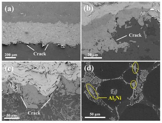 Figure 7 illustrates the interfacial microstructures of the Al/Fe alloys hybrid structures observed at different solution temperatures, followed by air cooling. Cracks occurred between the nickel coating layer and the Al matrix at 500 °C temperature (Figure 7a). At temperatures of 530 °C and 550 °C, cracks formed between the intermetallic layer and the Al matrix, as shown in Figure 7b,c. Hence, cracks occurred at the interface due to air cooling, regardless of the heat treatment temperature. We believe this was due to a large thermal gradient created by air cooling. Thermal stress during heat treatment is created by the difference in CTE between the two materials in contact at the interface []. The CTEs in the two materials in the hybrid materials are different, resulting in disparate contraction rates during rapid cooling. This disparity caused severe thermal shock at the interface, which in turn escalated the thermal stress applied to the interface. The results show that furnace cooling was vastly superior to air cooling for promotion of superior chemical bonding at the interface of the Al/Fe alloys hybrid structure. Furthermore, the Al3Ni phase was precipitated in the Al matrix close to the interface of the Al/Fe alloys hybrid structure, after heat treatment at 550 °C followed by air-cooling (Figure 7d). However, as shown in Figure 5c, which shows the furnace cooling conditions after the same heat treatment process, Al3Ni was not observed in the Al matrix, indicating that the cooling rate also affects the type of intermetallic phase formed. Under these particular heat treatment conditions, the Al3Ni that was formed in the Al matrix, transformed into Al3CuNi during the furnace cooling stage. In contrast, under a faster air-cooling rate, the reaction could not be completed and Al3Ni was precipitated in the Al matrix instead.