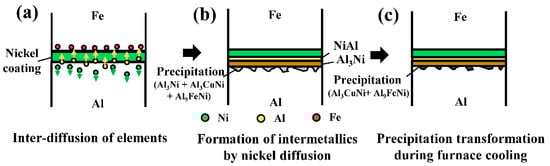 Figure 8 summarizes the chemical bonding mechanism of the Al/Fe alloys hybrid structure with nickel coating under optimized heat treatment conditions. During the 550 °C heat treatment process, inter-diffusion of Al and Ni occurred at the interface of the Al/Fe alloys hybrid structure during chemical bonding, whereas the Fe elements were obstructed by the nickel coating and did not diffuse into the Al matrix (Figure 8a). Figure 8b shows the intermetallics formed by the diffusion of elements at the interface and in the Al matrix during the heat treatment process. The type of intermetallics was dependent on the Ni:Cu ratio and generated a continuous layer at the interface. Finally, Figure 8c shows that the precipitated Al3Ni in the Al matrix transformed into Al3CuNi during the furnace cooling process, and superior chemical bonding was achieved at the interface.
