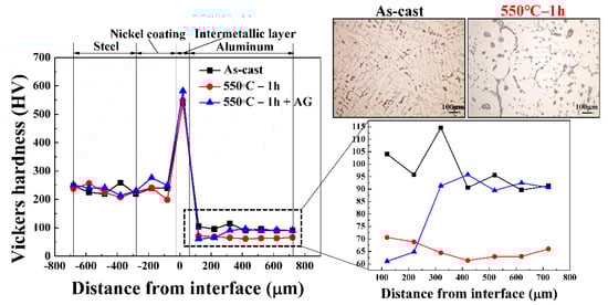 Micro-hardness distribution across the Al/Fe alloys hybrid structure’s interface under as-cast and heat treatment conditions; AG: Artificial aging.