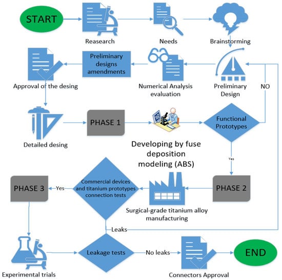 Nowadays, in Mexico, the Baxter® and PISA® companies are two different brands dedicated to providing support to connection elements for peritoneal dialysis. Connection systems for CAPD should ensure the safety of the patient by decreasing the incidence of infections due unclean handling. The methodology used in this work is based on nephrology, and we developed a device through preliminary sketches. Through numerical simulations, we achieved a detailed design for developing a prototype in order to verify its functionality. Finally, prototypes with specific treatment characteristics were developed under medical-grade alloy and subjected to experimental tests. The materials used to carry out the present work are classified into three phases. The first one involves using the 3D prototyping technique in acrylonitrile butadiene styrene (ABS) to obtain a visual studio to establish improvements in the connectors. The second stage consists of manufacturing the detailed design in titanium “Ti-6Al-4V ELI”, which has been used as a material in prostheses and stents and has received acceptance from the health sector [16]. Finally, in the third stage, an experimental testbed is built to evaluate the connection thread areas in equipment from the different brands already mentioned. Figure 1 shows a flowchart considering the methodology and stages for the design of each connector.