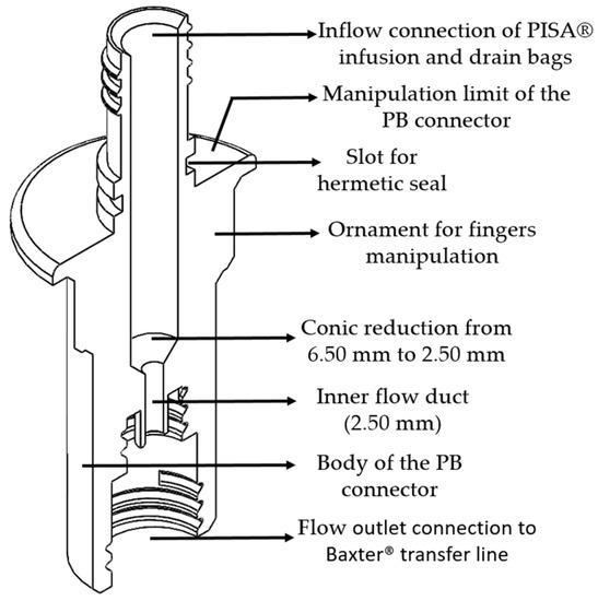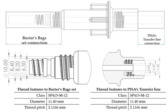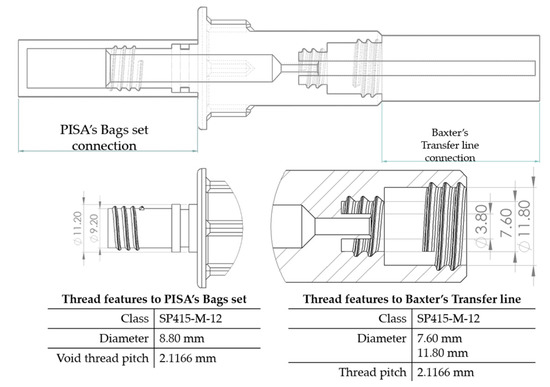 On the other hand, from the PISA bags connected to the Baxter transfer line, the PB connector was suitable for accomplishing the connection. Figure 7 shows a sketch of the connection points and thread features.