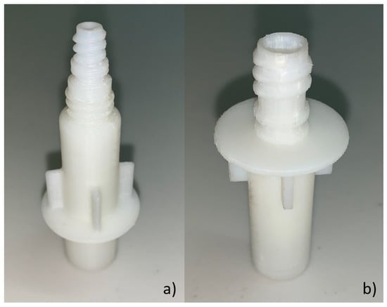 Three-dimensional models support the connection tests carried out under visual examination and allow us to establish each developed connector’s correct functionality. The connection between these prototypes and the commercial devices used a detailed design to ensure that the thread connection and geometry were accurate for each connector. Additionally, 3D models in ABS were essential, as they allowed a visual analysis of the strategical manipulation in the medical sector, specifically in CAPD. Then, numerical simulations we performed considering the material properties. Figure 5 shows BP and PB connectors in ABS material made by a 3D printer.