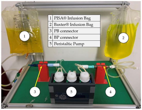 The aluminum MoAs IPS bars allowed malleability in joining the BP and PB connectors in an ideal way to the branded products to perform the treatment as well as possible. The experimental testbed was adequate to visualize the fluid exchange configuration between the manufactured connectors and equipment from the most used brands in the Mexican health sector. The infusion bags were placed in a higher position for each connector used in the treatment of CAPD. A peristaltic pump was used to move the liquid through the connectors from the infusion bags to the drain bags. Figure 10 shows a diagram of the functionality and connection points among devices (commercial brands and BP and PB connectors).