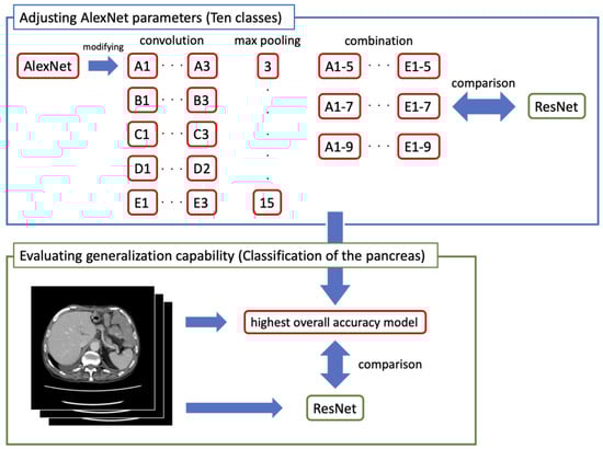 We defined training and accuracy verification images as the following four classes: the presence or absence of the pancreas with and without contrast media. Training images were 1500 images per class, and accuracy verification images were 500 per class. ResNet and the model with the highest overall accuracy among the created models were trained, and we compared the overall accuracy, confusion matrix, and calculation time. Figure 3 shows the entire learning and evaluation process. For the training, we used a PC with NVIDIA GeForce GTX TITAN X 12GB (NVIDIA Corporation, Santa Clara, CA, USA).