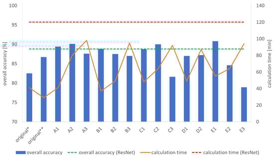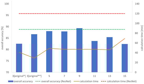 Overall accuracies and calculation times of the models with the filter sizes of max-pooling (original *: original (input image size: 224 × 224), original **: original (input image size: 512 × 512)).