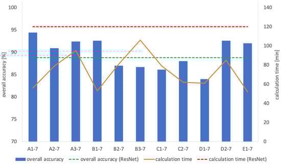 When the filter sizes of max-pooling were changed to an odd number from 5 to 15, the models with filter sizes 5, 7, and 9 exceeded original (input image size: 512 × 512), and the models after 11 were less than original (input image size: 512 × 512). This is because the overall features can be extracted by increasing the filter sizes of max-pooling to fit the 512 × 512 images. However, if the filter sizes of max-pooling are made too large, extraction of detailed features is not possible, and the overall accuracy is reduced. On the other hand, the calculation time was almost constant. Max-pooling is an operation used for the extraction of the maximum value, and the amount of the calculation is not large. Therefore, the calculation time was constant, even if the filter size was increased. When combining the filter sizes of the convolution layer and max-pooling, which had high overall accuracy, the overall accuracy of A1-7 was the highest. A1 and the model in which the filter size of max-pooling was 7 were not the most accurate models when changed separately. Combining the parameters of the model with the highest overall accuracy does not mean that a model with higher overall accuracy can be created. Thus, the overall accuracy varies depending on the affinity of the parameter combinations.