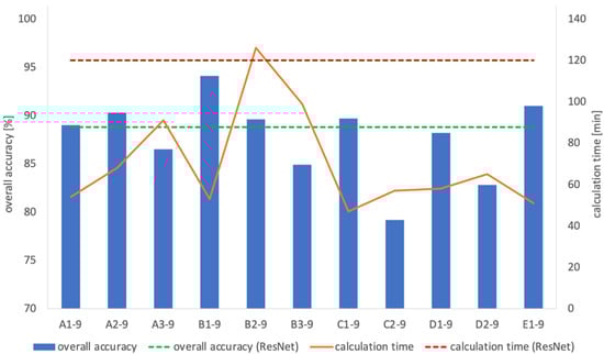 Table 1 shows the overall accuracies and calculation times of the original AlexNet trained with 224 × 224 and 512 × 512 images. In the comparison between original (input image size: 224 × 224) and original (input image size: 512 × 512), original (input image size: 512 × 512) had higher overall accuracy and a shorter calculation time. Figure 4 presents the overall accuracies and calculation times of the models in which the filter sizes of the convolution layer were changed, and Figure 5 shows the overall accuracies and calculation times of the models in which the filter sizes of max-pooling were changed. The models exceeding the overall accuracy of original (input image size: 512 × 512) were A1~3, B1~3, C1~2, D1~2, and E1, and the models with filter sizes of max-pooling were 5, 7, and 9. Figure 6, Figure 7 and Figure 8 show the overall accuracies and calculation times of the models with all combinations of these parameters. Among these models, the highest overall accuracy was in model A1-7. The filter sizes of the convolution layer for A1-7 were (13, 13), (7, 7), (5, 5), (5, 5), and (5, 5) in order from the first layer, and that of max-pooling was (7, 7). The overall accuracy of A1-7 was 94.40%, and the calculation time was 56 min. Figure 9 displays the confusion matrix. In contrast, the overall accuracy of ResNet was 88.80%, and calculation time was 120 min. The confusion matrix is shown in Figure 10. In the comparison of A1-7 and ResNet, A1-7 was superior in both overall accuracy and calculation time.