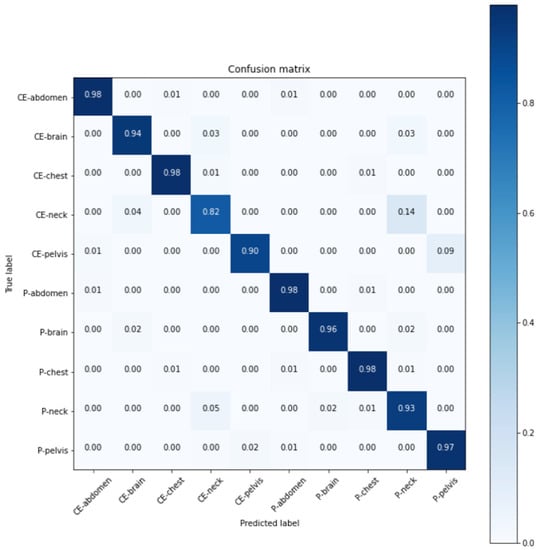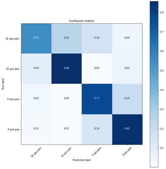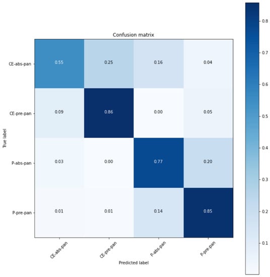 Confusion matrix of ResNet (CE: contrast-enhanced, P: plain).
