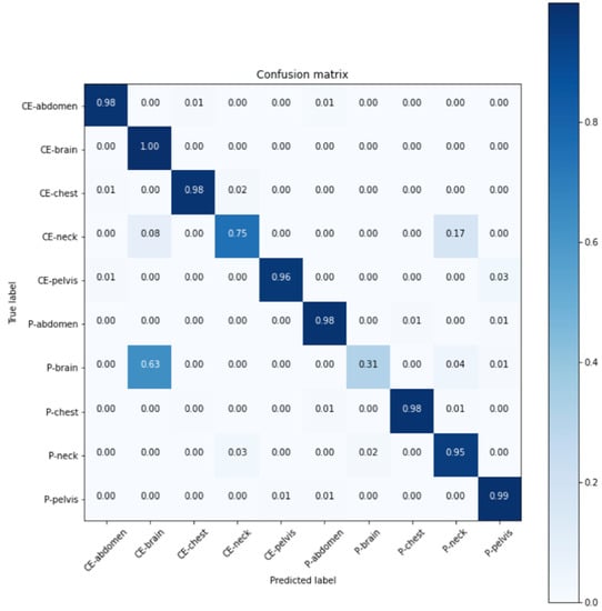 Confusion matrix of A1-7. (CE: contrast-enhanced, P: plain).