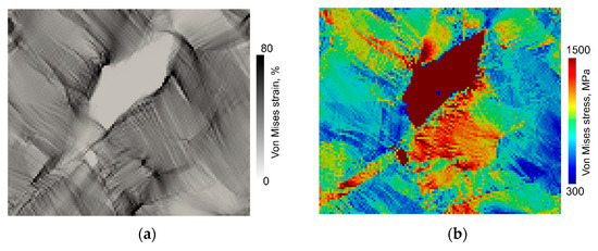 Since the actual microstructure is different from what was modeled in the previous example, an actual EBSD data set was used to develop a new simulation model at this step. The geometry only comprises one big and one small MgO-PSZ particle. The stresses and strains observed in the microstructure at the global deformation of 25% are shown in Figure 11.