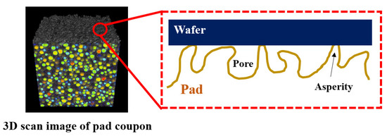 In CMP, material removal occurs as a result of friction between the wafer surface, the polishing pad, and the abrasive particles in the slurry under a chemical reaction caused by the chemical components of the slurry []. The polishing pad is one of the most important consumables. It is attached to the bottom plate, and polishing proceeds by the relative pressure caused by contact between the pad and the wafer. For ideal polishing, the pad should maintain uniform and rough contact. This can control the overall pad asperity height, minimize pad deformation, minimize the pad wear rate, and maintain the pad’s material properties [,,].