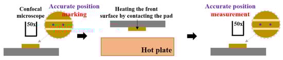 Physical properties of the polishing pad change according to temperature and undergo thermal deformation [,]. However, research on how it expands and changes during thermal expansion is insufficient. The process for observing the change in the state of the surface with changes in the pad temperature is illustrated in Figure 2. First, a position was precisely marked on the surface of the pad sample to enable the surface to be inspected before and after heating. Then, the pad sample was heated by direct contact with a hot plate. The temperature was increased from 20 °C (room temperature, RT) to 80 °C The surface was examined with a confocal microscope both before and after heating.