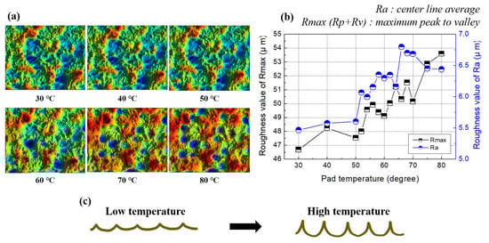 Characterization of the pad surface using a confocal microscope was preliminarily investigated with a reference pad and several sample pads that were heated from 30 °C to 80 °C. The reproducibility of the change was confirmed by applying the same location and measurement conditions. In general, the change in asperities according to temperature or the abrasion of asperities occurring during the CMP process is strongly related to the surface roughness height factor []. Therefore, a comparative analysis was performed on the surface roughness factors, focusing on the values of Ra (arithmetical mean height), Rp (maximum profile peak height), and Rv (maximum profile valley depth). Figure 3a is a set of SEM images showing the changes in the pad surface according to temperature, and Figure 3b is a graph showing the surface roughness results for each heated pad. The pad used in the experiment was performed after applying a short conditioning process to evenly distribute the entire pad surface. In Figure 3a, by comparing the SEM images of the pad heated to 30 °C (room temperature) with those treated with higher temperatures (40–80 °C), it was confirmed that the height distribution changed as the temperature increased, and it was observed that a circular pore shape became apparent at the higher temperatures. In addition, this trend could be confirmed in the measured surface roughness values as shown in Figure 3b. While the change of the pad surface was insignificant in the low-temperature area close to room temperature, the surface roughness values all showed a tendency to increase above a certain temperature (50–60 degrees). Therefore, through this measurement, it could be predicted that the change of the surface according to the pad temperature is the main change in the height distribution of the surface as shown in Figure 3c.