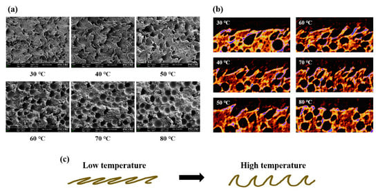 (a) SEM top-view images, (b) micro-CT cross-section images according to steady-state surface temperature of the pad and (c) changes in the pad surface depending on the temperature expected through SEM and micro-CT measurement.