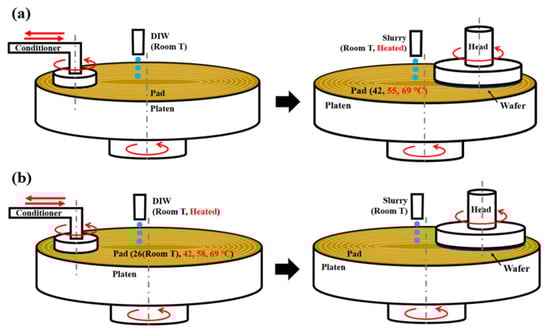 Illustration of (a) continuous CMP process experiment with temperature control (without conditioning) and (b) conditioning effect experiment with temperature control.
