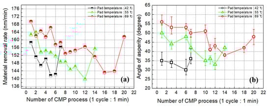 A series of CMP experiments, each for 1 min, were performed continuously with fumed silica slurry on a break-in pad without conditioning process, as shown in Figure 7a. It could be observed that the removal rate gradually decreased as the CMP process progressed under three pad temperature conditions. The removal rate considered to be additionally necessary for the conditioning process was set to 140 nm/min. After certain runs (42 °C, 5th run; 55 °C, 12th run; 69 °C, 18th run), the removal rate tended to be very low. Even within these trends, when the pad temperature was high during this CMP process, the removal rate was higher, and the reduction rate of the removal rate was low relative to that at the lower temperatures. In addition, when the removal rate in the range of 140 nm was obtained for each condition, the conditioning process was performed, and it was confirmed that the removal rate and the asperity angle were recovered. From Figure 7b, it can be seen that the pattern of the asperity angle at this time is similar to the pattern of the removal rate. Thus, this investigation of the relationship among pad temperature, removal rate, and asperity angle found that the tendency for the asperity angle to increase has a positive effect on the contact with the wafer and further influences the MRR.