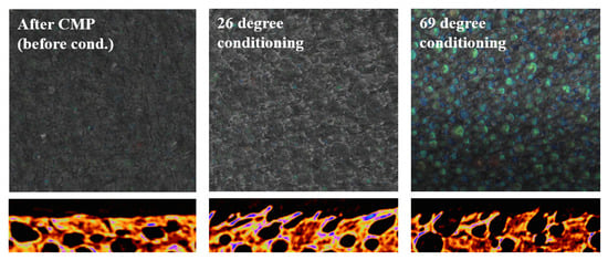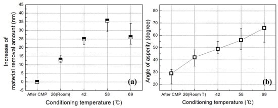 Figure 10a shows the results regarding the increase in the material removal rate according to the temperature during the conditioning process. The experiment used pads that underwent long-term polishing and glazing without a conditioning process. To set the temperatures of the pads during conditioning at 4 levels (26, 42, 58, and 69 degrees) deionized water at suitable temperatures was provided. Temperature errors of 1–2 degrees occurred at each temperature during processing. In each case, when the polishing process was performed directly after conditioning, it was found that the material removal rate increased proportionally as the pad temperature increased during conditioning []. The highest material removal rate increase occurred at 58 °C and trended downward at 69 °C. Figure 10b shows a graph of the asperity angles at each pad temperature. As with the increase in the material removal rate, the asperity angles likewise increased linearly in proportion to the temperature. Thus, it was found that the asperity angles changed according to the pad temperature in the conditioning process as well, and this may have a positive effect on restoring the material removal rate of worn pads. However, at excessively high temperatures such as 69 °C, the material removal rate decreased regardless of the angles of the asperities. This is believed to be caused by the increase in pad residue that occurs during high-temperature conditioning and the resultant clogging of the pores.