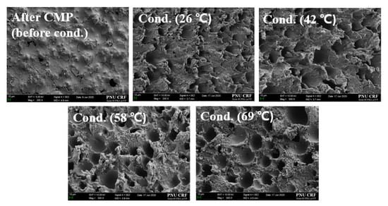 SEM images of pad surface according to pad temperature during the conditioning process (captured immediately after one cycle of the polishing process at four temperatures: 26, 42, 58, and 69 °C).