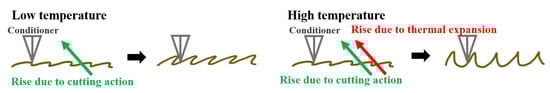 The asperity change on the pad surface in conditioning process according to pad temperature can be represented as shown in Figure 13. The conditioning process is a cutting process to restore the surface roughness of the glazed pad. The conditioning process at a relatively low temperature only generates a cutting effect without the effect of increasing the pad asperity angle. On the other hand, in the conditioning process at a high temperature, a synergistic effect of the pad asperity angle occurs when the surface is cut by diamond particles. Due to this, the pad surface has a rougher and sharper shape, and eventually the material removal rate at this time is higher.